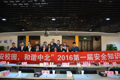 为增强我校大学生安全意识,创建平安和谐的校园环境,2016年11月20日上午,由校安全保卫处主办,材料科学与工程学院团委承办的 “平安校园,和谐中北”2016第一届大学生安全知识竞赛在我校后勤服务中心会议大厅顺利举行。此次竞赛共有13个学院的代表队参加,出席此次竞赛的嘉宾有中北大学副校长潘晋孝教授,校安全保卫处处长杨正民老师,学生处副处长顾宁老师,校团委副书记魏翀老师,机电工程学院党委副书记刘光老师,材料科学与工程学院党委副书记廖海洪老师,艺术学院党委副书记田维飞老师,保卫处郭薇薇老师和向远峰老师,材料学院毋登辉老师。