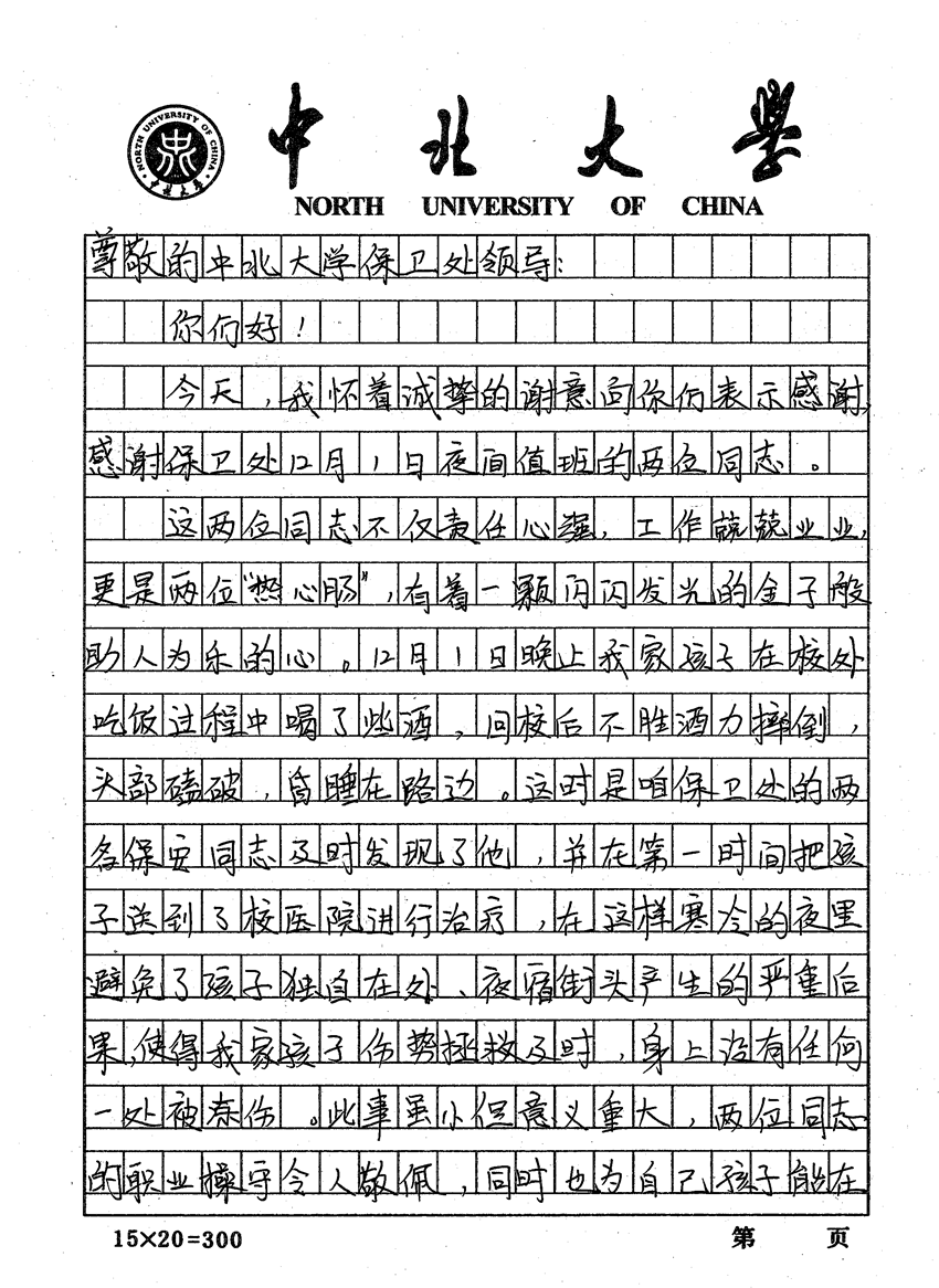 事后第二天,家长及时赶往学校,心情久久不能平静,特地向校安全保卫处写了这封感谢信,感谢王俊伟、刘国安两位保安同志的热心帮助。家长在信中深情的写到:“在这样寒冷的夜里避免孩子独自在外,夜宿街头产生的严重后果,使得我家孩子伤势拯救及时,身上没有任何一处被冻伤。此事虽小,意义重大,两位同志的职业操守令人敬佩,同时也为孩子能在这样的校园学习、生活感到高兴。”