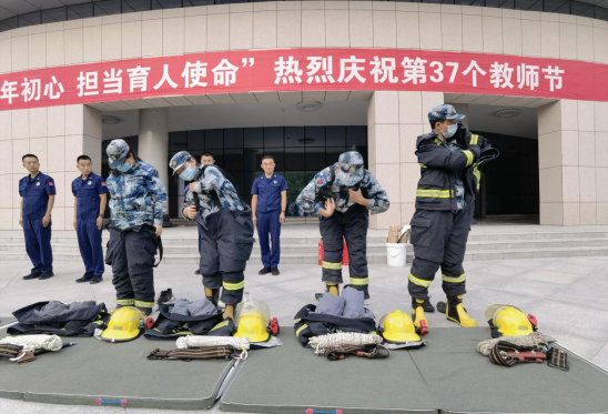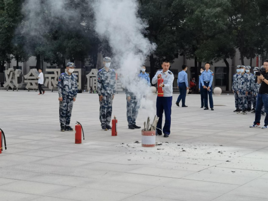 讲座后,在室外互动环节中,同学们在太原市尖草坪区消防救援大队官兵的指导下观看和体验了原地消防装备穿戴,练习了使用干粉灭火器进行初期火灾的扑救。